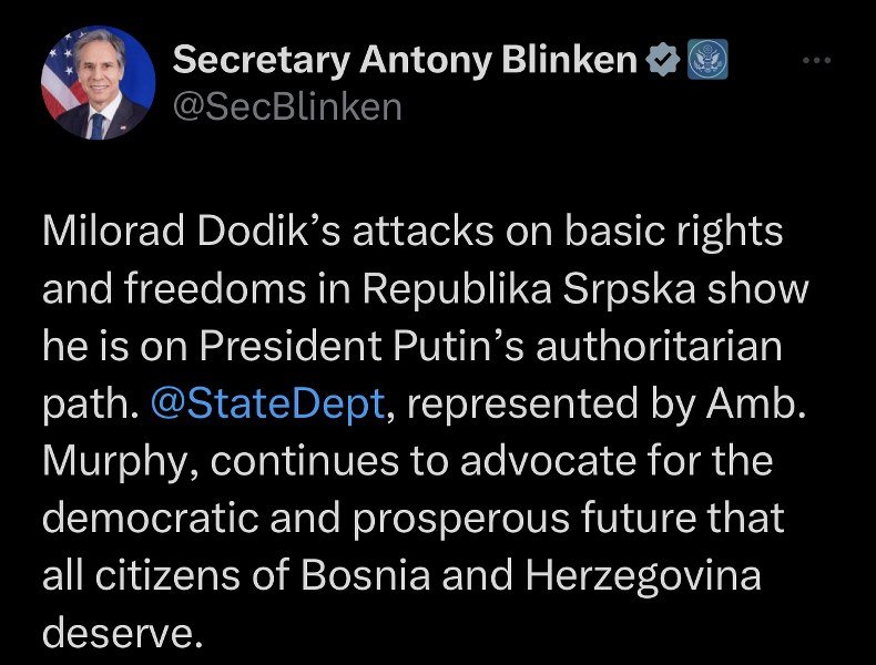 “Napadi Milorada Dodika na osnovna prava i slobode u Republici Srpskoj pokazuju da je na autoritarnom putu predsjednika Putina. Stejt Department kojeg zastupa Ambasador Majkl Marfi, nastavlja da se zalaže za demokratsku i prosperitetnu budućnost svih građana Bosne i Hercegovine”, napisao je Blinken na svom Tviter profilu 29.03. o.g.