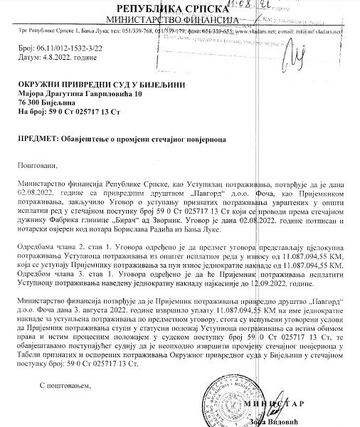 „Ministarstvo finansija potvrđuje da je ’Pavgord’ 3. avgusta uplatio 11,1 milion KM na ime jednokratne naknade za ustupljena potraživanja, čime su ispunjeni uslovi da prijemnik potraživanja stupi u statusni položaj ustupioca potraživanja sa istim obimom prava te obavještavamo stečajnog sudiju da je neophodno izvršiti promjenu stečajnog povjerioca u tabeli priznatih i osporenih potraživanja“, navedeno je u dopisu Ministarstva finansija RS.