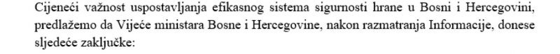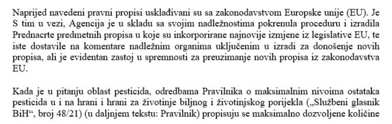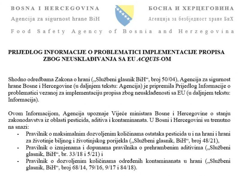Kako su obrazložili u aktu odaslanom Vijeću ministara BiH, kada je riječ o pesticidima, aditivima i kontaminantima, trenutno su u BiH na snazi pravilnici o dozvoljenim količinama pesticida u hrani, zatim o prehrambenim aditivima i o dozvoljenoj količini kontaminanata u hrani.