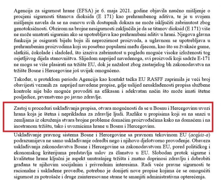 -Slijedom navedenoga, svi proizvodi koji sadrže E-171 ne mogu se više plasirati na tržište EU, dok je nažalost zbog zastarjelog bh zakonodavstva na tržište Bosne i Hercegovine još uvijek omogućeno – konstatovali su iz ove agencije.
