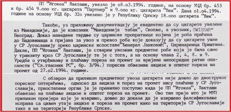 „MUP je došao do dokaza da je izvršeno falsifikovanje isprava sa ciljem utaje akciza i poreza na promet, kako na teritoriji SR Jugoslavije, tako i na teritoriji RS“, navodi se u Rješenju Finansijske policije RS na žalbu Dodikove firme Igokea iz Laktaša.