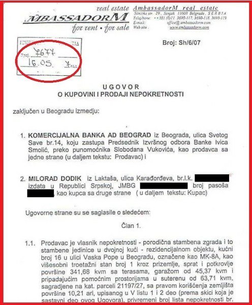 Prije nego što će krenuti iz Beograda Dodik je sa Komercijalnom bankom potpisao ugovor o navodnoj kupovini navedenog troetažnog stana i garaže u beogradskom naselju Dedinje.