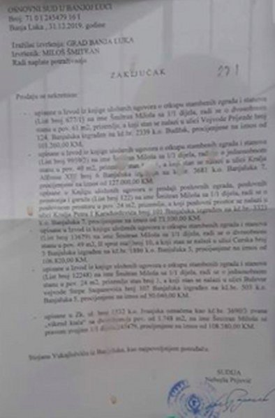 Uplatio je 28.01. 2019. godine avans od 283.400 KM za te nekretnine, ali sam razotkrio cijelu kriminalnu operaciju, pa je, nekim čudom, reagovalo Javno pravobranilaštvo, uložilo žalbu, i cijeli slučaj je sada na Okružnom sudu kod sudinice Nadire Šibonjić.