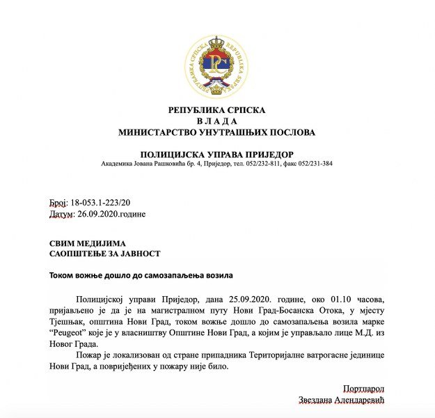 Nakon što sam u 16 časova i jedan minut objavio da je izgorio opštinski automobil ("Pežo 407") koji je vozio načelnik Novog Grada Miroslav Drljača, u 18 časova i dvanaest minuta iz PU Prijedor mejlom je proslijeđeno saopštenje u kojem se potvrđuje da je izgorio automobil, koji je vozio D.M.
