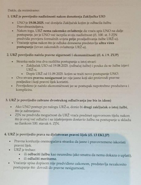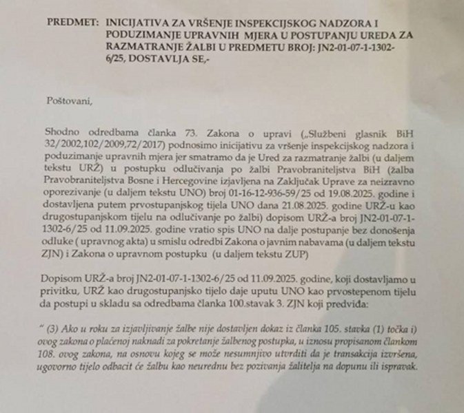Ističe se da je UIO odbacila žalbu Pravobranilaštva 19. avgusta 2025. godine na izbor najboljeg ponuđača, a da je KRŽ, umjesto da donese odluku u postupku, što je bila njena dužnost, 11. septembra 2025. godine ponovo vratila dokumentaciju UIO kao prvostepenom organu za žalbe, čime je prekršila zakon i unijela konfuziju dvostrukog odlučivanja.