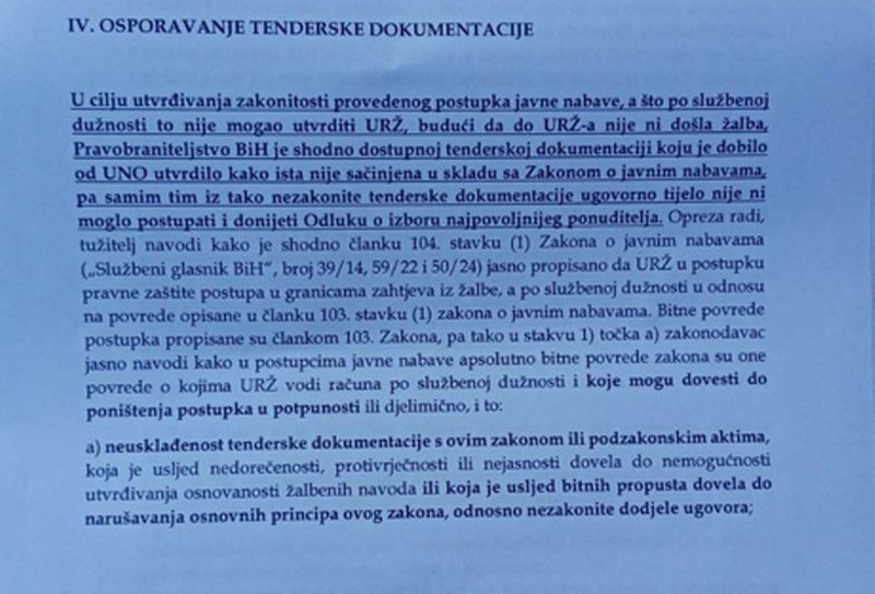 “Apsurdno je da se BiH nalaže plaćanje naknade za pokretanje žalbenog postupka, jer ona ne nastupa kao privredni subjekt, već kao institucionalni zaštitnik imovine i javnog interesa. UIO je pogrešno kvalifikovala pravni status podnosioca žalbe, zanemarujući Zakon o javnim nabavkama BiH koji ne propisuje obavezu plaćanja naknade“, navodi se u ovom dokumentu.