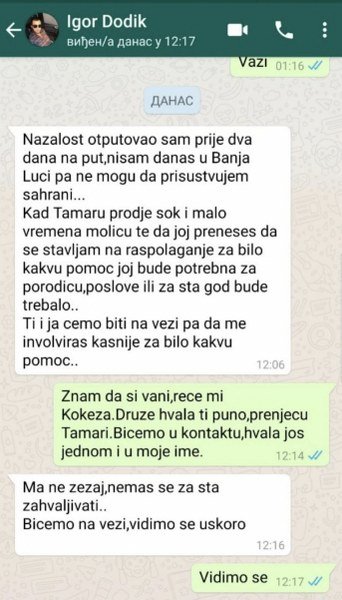 Poruka Igora Dodika za Tamaru Krunić, preko posrednika, na dan sahrane ubijenog Slaviše Krunića, 25.04.2019.