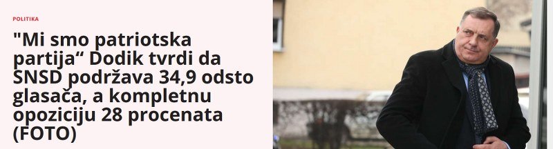 3. Čak i laici mogu jednostavno da zaključe da se radi o izmišljenom istraživanju. Ako se izuzmu SNSD i opozicione stranke, na političkoj sceni preostaju još: US, Demos, SP i koalicija bošnjačkih stranaka. Čavićev NDP ne računam, jer ta stranka više i ne postoji. Prema Dodikovoj računici US, Demos, SP i koalicija bošnjačkih stranaka imaju zbirnu podršku od 37,1 % biračkog tijela (pojedinačno po 9,28 %), što je u rangu naučne fantastike.