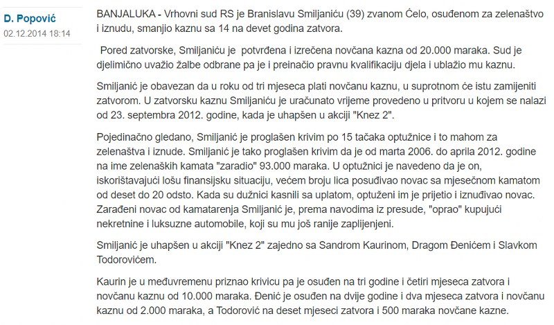 13. Potkovani je bio vrlo aktivan i u trgovini uticajem, a kao primjer ću navesti krivični postupak protiv banjalučkog zelenaša Branislava Smiljanića Ćele. Potkovani je preko Obrena Bužanina, sudije Vrhovnog suda Republike Srpske, sredio smanjivanje kazne sa prvobitnih 14 godina na 9 godina zatvora.