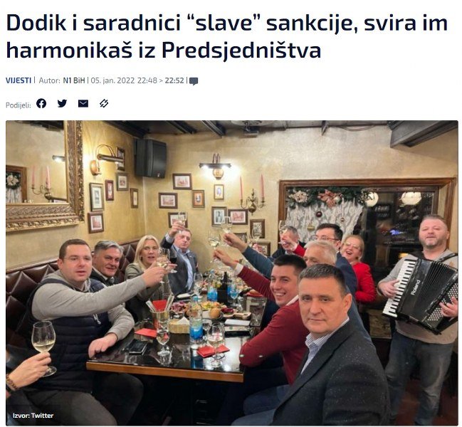 3. Kako bi umirio najbliže saradnike, Dodik je organizovao „proslavu“. Ako se pažljivo pogleda fotografija lažnih slavljenika, može se primjetiti da su na istoj vidno zamišljeni samo Dodik i Nebojša Radmanović. To i ne treba da čudi, jer su od okupljenih „slavljenika“ jedino njih dvojica dovoljno inteligentni da realno sagledaju posljedice odluke SAD.