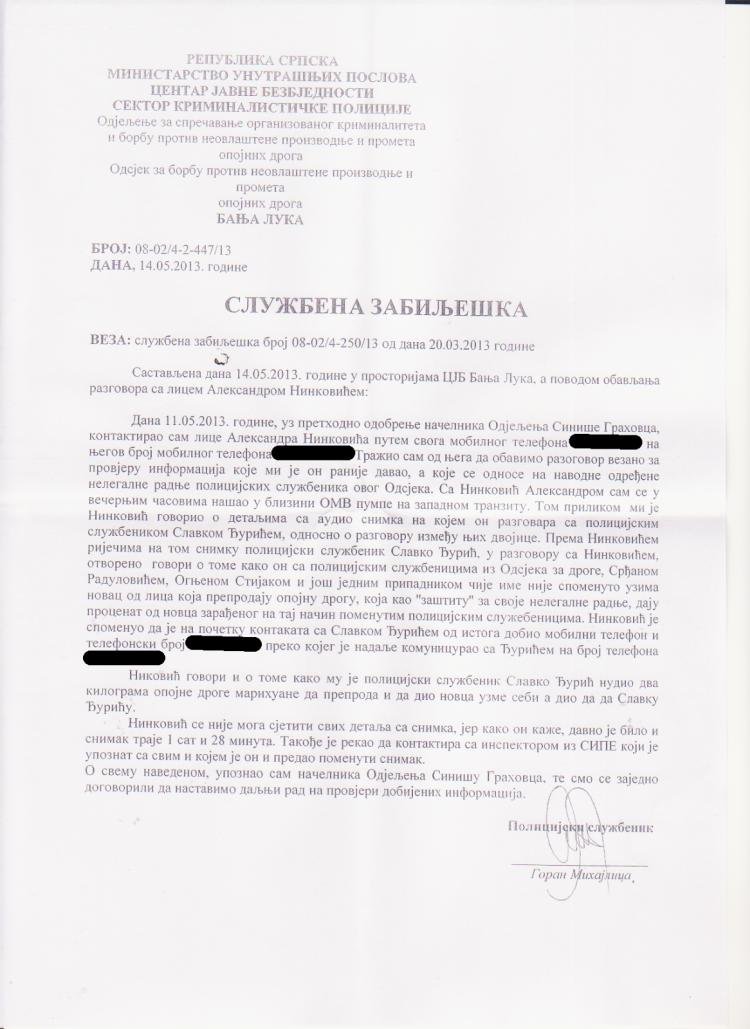 U njoj Mihajlica predočava Ninkovićeve tvrdnje o pritiscima da dila za policiju i o tome obavještava Sinišu Grahovca, načelnika Odjeljenja za borbu protiv nakotika. Grahovac tada nije učinio ništa. Nije završio ni na optuženičkoj klupi nakon što je sve otkriveno, već je pomjeren na drugu načelničku poziciju, objavio je Vasković.