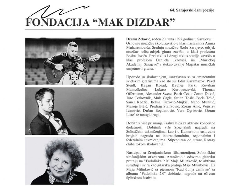 Održan poetsko - muzički performans "MakDan" - Za kraj trećeg dana festivala, 64. Sarajevski dani poezije, u petak 17.10.2025. godine u Galeriji Muzeja književnosti i pozorišne umjetnosti BiH (Sime Milutinovića Sarajlije br. 7) realizovan je Poetsko-muzički performans „MakDan“ povodom obilježavanja 108. godišnjice rođenja Maka Dizdara.