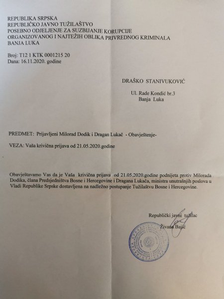 Zanimljivo je da je Stanivukoviću od republičkog javnog tuđioca obavještenje da je prijava protiv Dodika i Lukača proslijeđena na nadležno postupanje Tužilaštvu BiH napisano 16. novembra, dan nakon što je izabran za gradonačelnika Banjaluke.