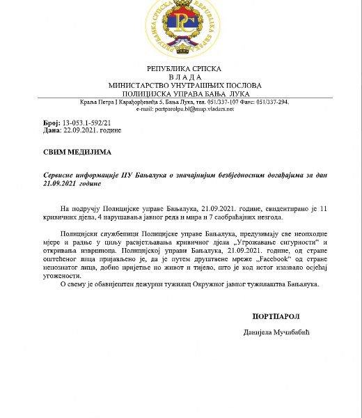 Foto: Saopštenje banjalučke Policijske uprave