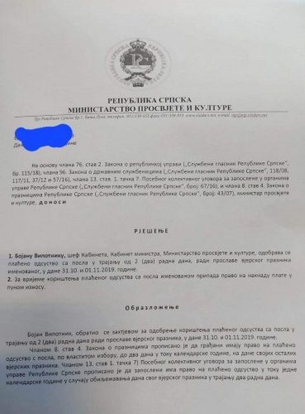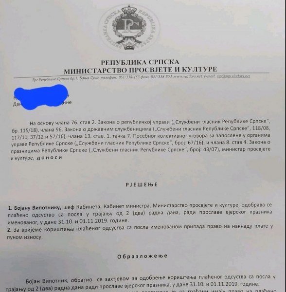 Vipotnik je kadar Ujedinjene Srpske Nenada Stevandića, donedavno je bio šef Kabineta ministarke prosvete i kulture Natalije Trivić, i redovno je, svake godine tokom rada u Vladi Republike Srpske, Rješenjem ministarke dobijao je 2 slobodna dana za vjerski praznik Svetog Luku, 31.10. i 1.11.