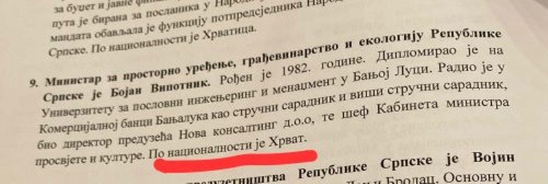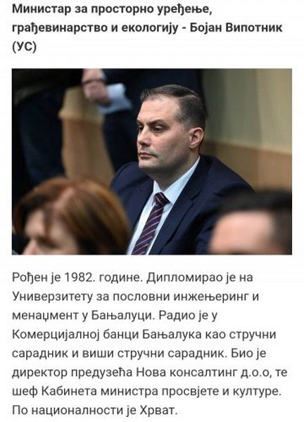 Sve do nazad nekoliko dana, ili najviše nekoliko mjeseci, novoimanovi ministar Bojan Vipotnik, rođeni Banjalučanin, bio je Srbin pravoslavac koji je slavio Svetog Luku, a onda je naprasno preko noći promijenio naciju i postao Hrvat kako bi ga imenovali za ministra!?