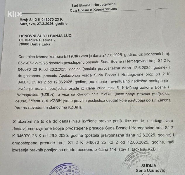 Umjesto toga, Sud BiH i ovaj put krajnje neodređeno traži da se izvrši njegova krivična presuda od 26.2.2025. godine protiv Milorada Dodika, a u njoj nema pa nema ni slova o tome da ona za pravnu posljedicu ima zabranu Miloradu Dodiku da obavlja funkciju predsjednika SNSD-a.
