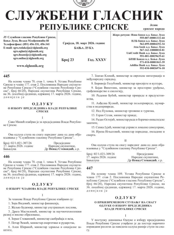 U "Službenom glasniku Republike Srpske", broj 23 od 18. marta 2026. objavljene su odluka Narodne skupštine Republike Srpske o izboru Save Minića za predsjednika Vlade, te odluka o izboru članova Vlade Republike Srpske.