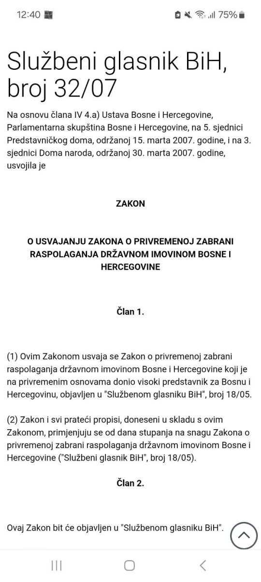 Međutim, i tu je stvarnost sasvim drugačija. Naime, 2005. godine tadašnji visoki predstavnik Pedi Ešdaun nametnuo je svoj zakon o privremenoj zabrani raspolaganja državnom imovinom. Nakon toga, u martu 2007. godine Parlamentarna skupština BiH je donijela Zakon o usvajanju Zakona o privremenoj zabrani raspolaganja državnom imovinom ("Službeni glasnik BiH", broj 32/07), kojim je, u članu 1, propisano (što je ostalo na snazi sve do danas), da se tim zakonom "usvaja Zakon o privremenoj zabrani raspolaganja državnom imovinom Bosne i Hercegovine koji je na privremenim osnovama donio visoki predstavnik za Bosnu i Hercegovinu".