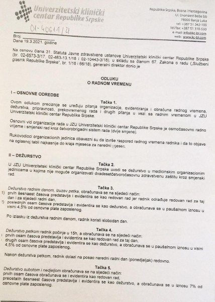 Tako je direktor UKC RS Vlado Đajić, 19.03.2021., potpisao Odluku o radnom vremenu kojom se, defakto, smanjuju plate ljekarima, među kojima su i oni koji vode tešku bitku sa Kovid-om, za, prosječno, 250-300 KM mjesečno.