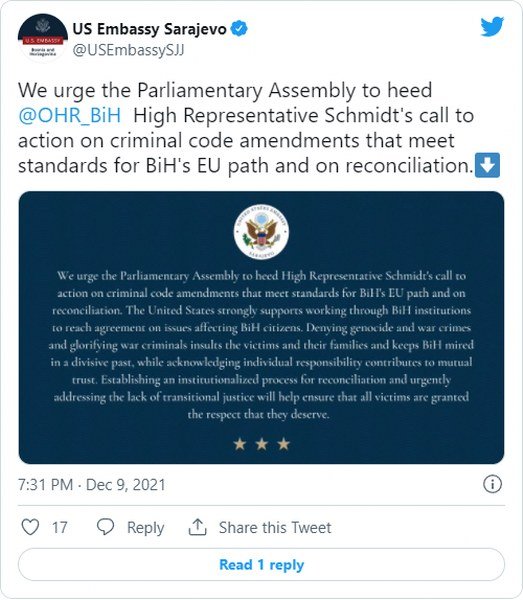 “Pozivamo Parlamentarnu skupštinu Bosne i Herzegovine da poslušaju poziv Visokog predstavnika Christiana Schmidta za usvajanje amandmana na Krivični zakon, kojim bi se ispunili standardi na putu BiH ka Europskoj uniji i pomirenja”, poručeno je iz ambasade.