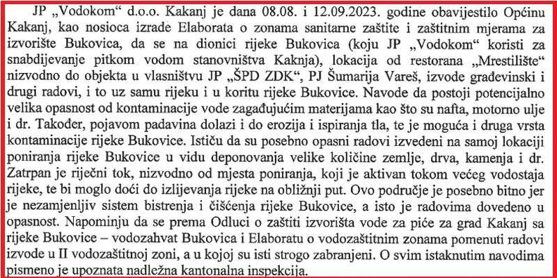 Dalje u svom dopisu Općina Kakanj upozorila je na stanje u i oko korita rijeke Bukovica i Borovičkog korita koji se koriste za snadbijevanje vodom za piće Općine Kakanj.