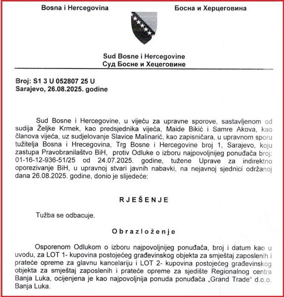 Sutkinje Suda Bosne i Hercegovine Željka Krmek, Maida Bikić i Samra Akova odbacile su kao „preuranjenu“ tužbu Pravobranilaštva Bosne i Hercegovine protiv Uprave za indirektno oporezivanje BiH u kojoj su navedene sumnje na namještanje tendera za kupovinu zgrade u Banjaluci, koja je u vlasništvu Mileta Radišića, presuđenog kriminalca i kuma presuđenog, bivšeg predsjednika Republike Srpske Milorada Dodika.