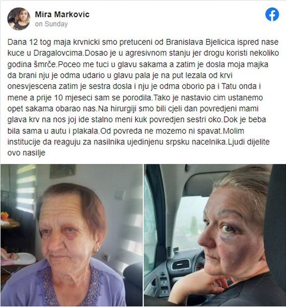 "Policija je stigla, uzeli su našu izjavu. Poslali su nas u Stanare u Hitnu pomoć, odakle su nas uputili u Doboj na Hirurgiju. Tu smo ostali skoro cijeli dan. Sestra ima povredu oka, ja kuka, mama vilice, non - stop joj krv ide na nos, ne može ni da jede. Otac je pao na travu, na sreću. Sve nas je krvnički pretukao", priča Bjeličićeva, u potresnoj izjavi za "Nezavisne novine".