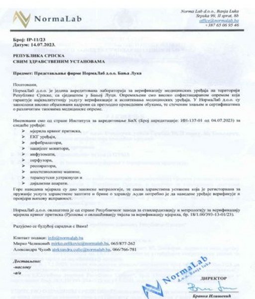 Kako su nam potvrdili, rukovodioci zdravstvenih ustanova u Republici Srpskoj su već duže vrijeme u finansijskom problemu i izloženi su nevjerovatnim pritiscima i prijetnjama od laboratorije „NormaLab“ iz Banja Luke, kćerka firme „Infinity“, za potrebnom verifikacijom, tj. kolokvijalno rečeno „baždarenjem“ određenih medicinskih uređaja sa funkcijom mjerenja koji se koriste u zdravstvu, zato što oni već izdvajaju velika sredstva za servis i održavanje tih medicinskih uređaja kako bi bili u ispravnom stanju, a sada će morati dodatno da izdvajaju velika sredstva kako bi laboratoriji „NormaLab“ platili u toku godine za ono što su već platili ovlašćenim serviserima za isti period.