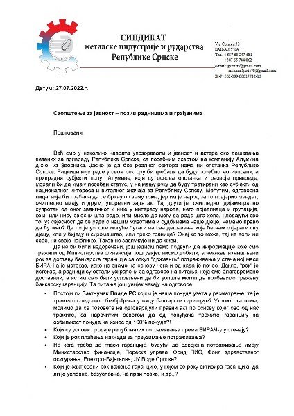 Saopštenje Sindikata: Otimanjem -Alumine- vlast je protiv naroda i radi za ličnu korist pojedinaca (Dokument)