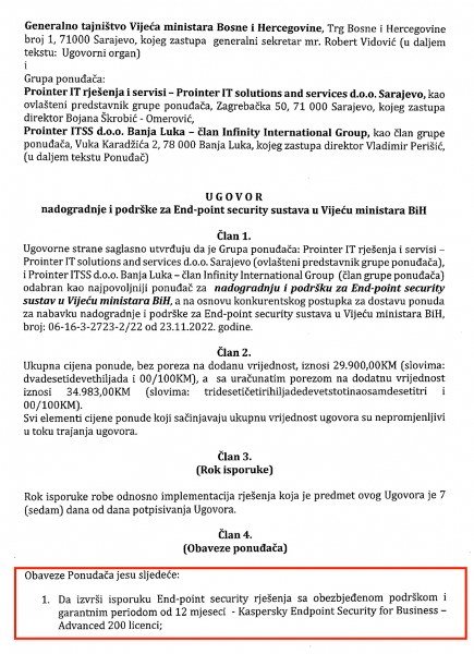 “Ugovorne strane saglasno utvrđuju da je Grupa ponuđača: Prointer IT rješenja i servisi – Prointer IT solutions and services d.o.o. Sarajevo, i Prointer ITSSS d.o.o. Banja Luka – član Infinity International Group odabran kao najpovoljniji ponuđač za nadogradnju i podršku za End-point securrity sustav u Vijeću ministara BiH, a na osnovu konkurentskog postupka za dostavu ponuda, za nabavku nadogradnje i podrške za End-point security sustava u Vijeću ministara BiH”, piše u članu 1 Ugovora koji potpisali Generalni sekretarijat Vijeća ministara BiH i zastupnik Prointera.