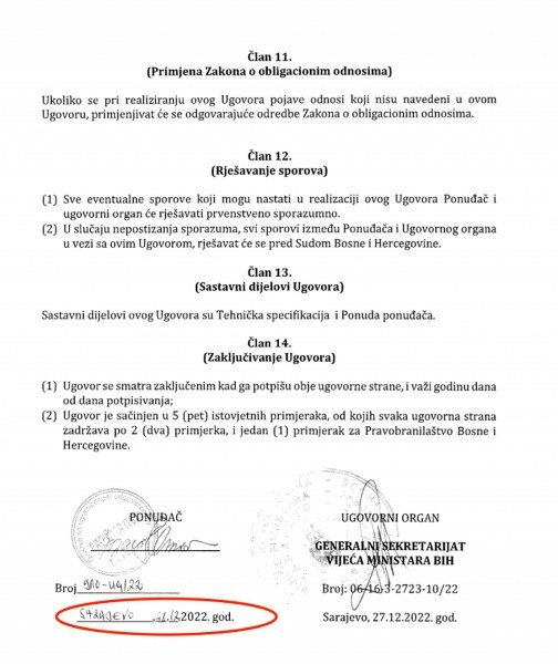 Predstavnik Prointera je svoj potpis na ugovor stavio 28. decembra 2022. godine, na dan kada je Predstavnički dom Parlamentarne skupštine BiH potvrdio Borjanu Krišto za predsjedavajuću Vijeća ministara BiH. Generalni sekreta Vijeća ministara BiH Robert Vidović (HDZ BiH) je ugovor potpisao dan ranije, 27. decembra 2022. godine.