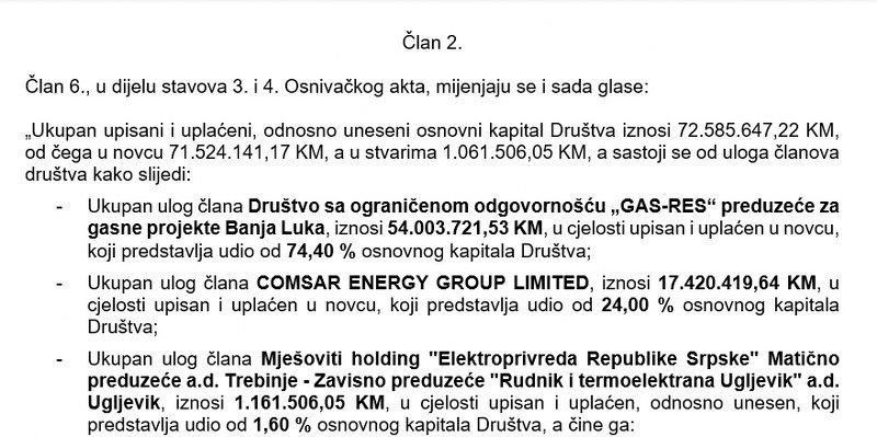 Prema ovom dokumentu, novi većinski vlasnik „Comsar RS“ je javno preduzeće „Gas-RES“ sa udjelom od 74,40 odsto, dok „Comsar Energy Group Limited“ sa Kipra, a koji je do sada imao najveći udio, zadržava 24 odsto.