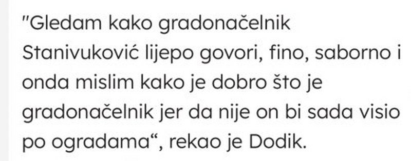 Moram priznati da je zakucavanje bilo sa stilom, ali nažalost i istinito, kada je Dodik sinoć rekao da bi Stanivuković visio na ogradi, da je na njegovom mjestu sada Igor Radojičić, napadao i kritikovao projekat pljačke naroda izgradnjom teniskog terena.