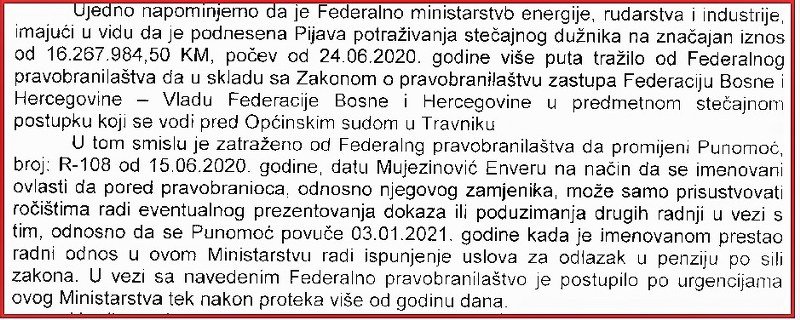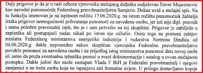 Ministarstvo je od juna 2020. godine nekoliko puta tražilo da federalni pravobranilac zastupa Vladu FBiH u stečajnom postupku u kojem Federacija kao povjerilac učstvuje sa 16 miliona maraka. Unatoč tome, sve donedavno kao predstavnik Vlade odnosno ministarstva u Odboru poverilaca učestvovao je isključivo Enver Mujezinović. Pri tome Mujezinović od 3. januara 2021. nije više uposlenik ministarstva gdje je bio pomoćnik direktora Direkcije za namjensku industriju FBiH zbog odlaska u penziju! Unatoč svemu Mujezinović učestvuje u radu Vijeća povjerilaca.