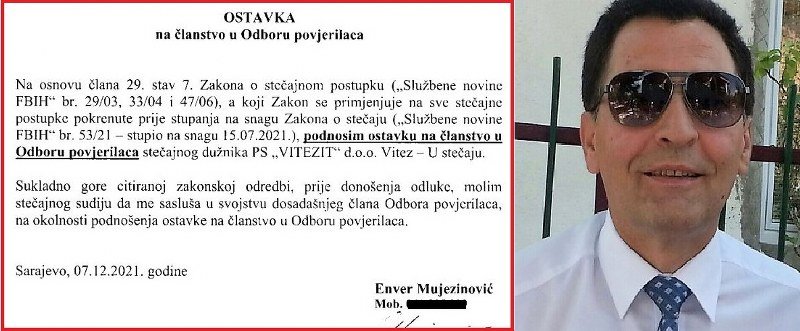Nekoliko dana kasnije, Enver Mujezinović dostavlja stečajnom sudiji ostavku na članstvo u Vijeću povjerilaca!? Očito ovaj iskusni bivši djelatnik jugoslavenske vojne Kontraobavještajne službe (KOS) ne može podnijeti da bude tek tako najuren nakon još jedne lažne uloge koju je odigrao, pa mora otići nezavršena posla za one kojima je obećao Vitezit u bescjenje. Pri tome nikada nije reagovao na navode kako je Vitezit pokraden i da su vrijedni pogoni i dokumentacija uglavnom ilegalno prodati Srbiji, odnosno tamošnjim fabrikama namjenske industrije, a dio opreme je potom završio u Iranu.