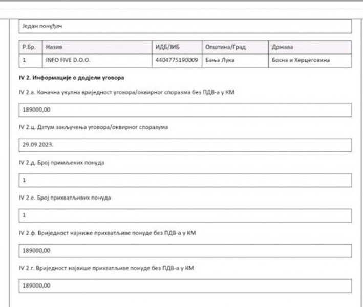 Kompanija „Info five D.O.O“ dobila je krajem septembra ove godine 210 000 maraka (189 000 bez PDV-a) od Vlade Republike Srpske za usluge medijske promocije i kreiranje kampanje preko internet platformi, a samo par dana nakon sklapanja Ugovora o promociji urađen je i objavljen intervju sa američkim ambasadorom.