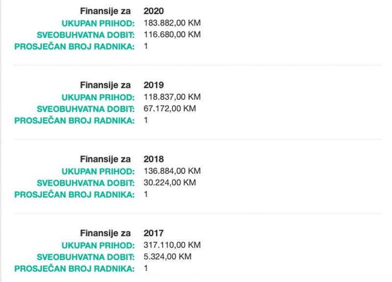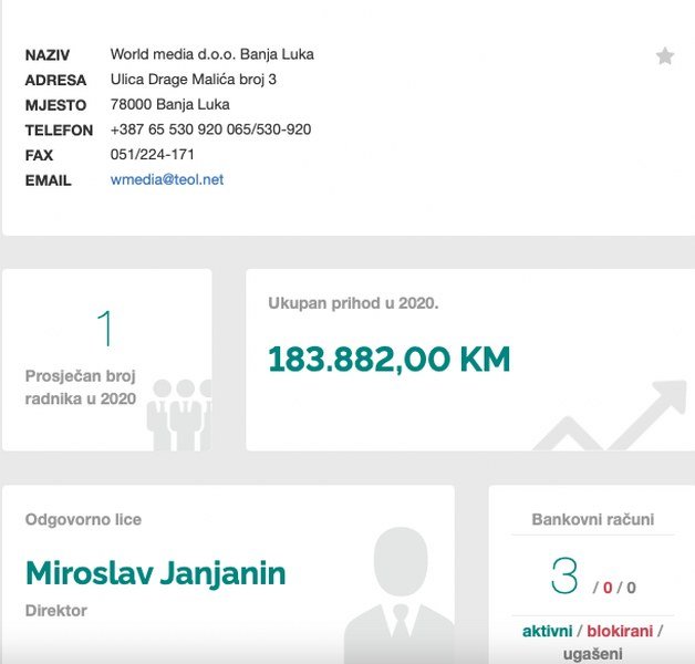 “World Media” ima samo jednog zaposlenog, ali taj jedan, ali vrijedan, odlično “radi” - u 2020. ostvario je dobit od 116.680 KM, dok je ukupna prihod bio 183.882 KM. Rijetko viđen poslovni uspjeh.