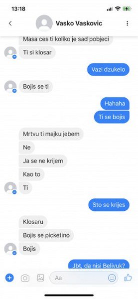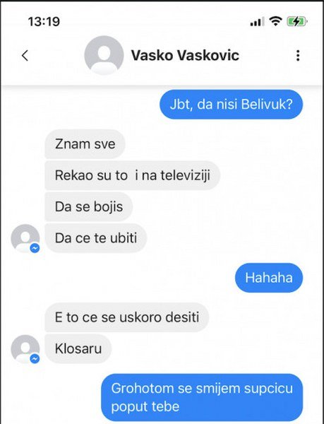 – Ubica, kako se sam predstavio, potpisao se kao „Vasko Vaskovic“, valjda u želji da pokaže kako je duhovit, iako je najobičniji mali, kukavički, preplašeni gmaz. Bolesni Idiot što se krije iza lažnog profila, spreman da ubije kako bi nastavio jezivi posao trovanja djece narkoticima. Interesantno je, osim što je nepismen, da mi obećava prvo mučenje, pa tek onda likvidaciju. Pravi Belivukov učenik! Što i ne čudi, jer su veze Belivukovog Monstruoznog Koljačkog Klana višestruke i snažno isprepletene sa brojnim visokim funkcionerima Crvene Sekte – napisao je Vasković.