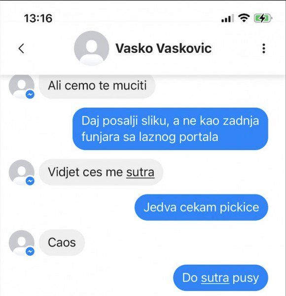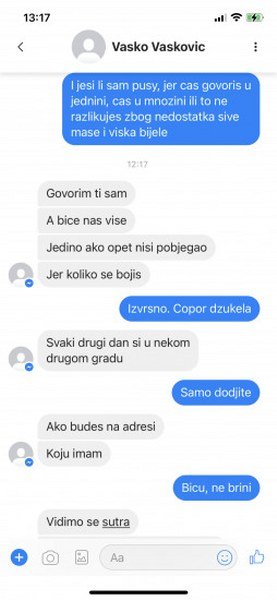 – I da traži, pa da je našao moju adresu. Mora da mu je pomogao Siniša Kostrešević, direktor policije, po Dodikovom nalogu. I u saradnji sa Kavčaninom Dejanom Ilićem Tigrom, Zoranom Prokletim Lihvarom Stevanovićem, Sinišom Mijatovićem, Vladom Crtom Đajićem, Ognjenom Savićem, Narkodilerom kojeg hapse u crvenim gaćama. Tvrdi da sam uplašen iako on lično drhti, jer se javlja sa lažnog naloga i ne smije sliku da pošalje. A fino sam mu ponudio da se predstavi. Da ne bude Pusy! – poručio je Vasković.