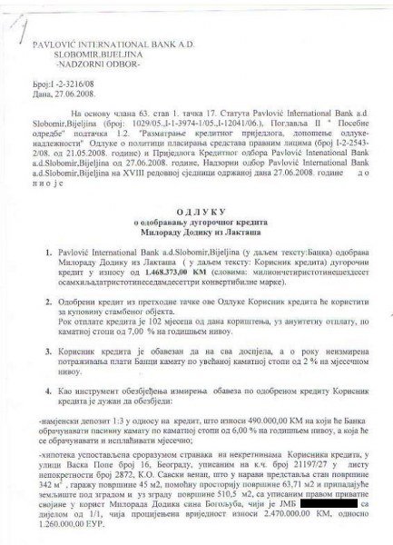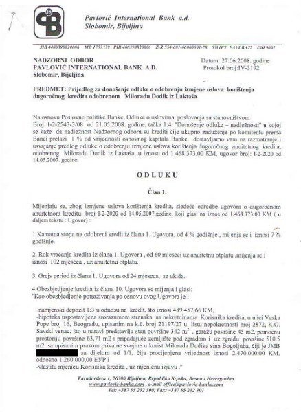 16. Dodik je tada tvrdio da je navodno podigao kredit od “Pavlović banke” kako bi platio vilu, ali se ispostavilo da je, opet navodno, kredit uzeo tek godinu kasnije nakon njene kupovine - 27.06.2008. godine, kada je on odobren.