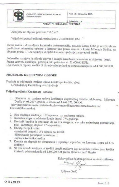 32. U isto vrijeme, prema navodima Tužilaštva BiH, Slobodan Pavlović je na svoj račun izvukao iz Banke, preko nekoliko firmi, 1,5 miliona KM i tim novcem je “garantovao” da će Dodik vratiti kredit od 1,5 miliona KM. Kvaka je u tome da Dodik, kako je istragom utvrdilo Tužilaštvo, nije podigao nikakav kredit u Banci, već je donio novac u kešu.
