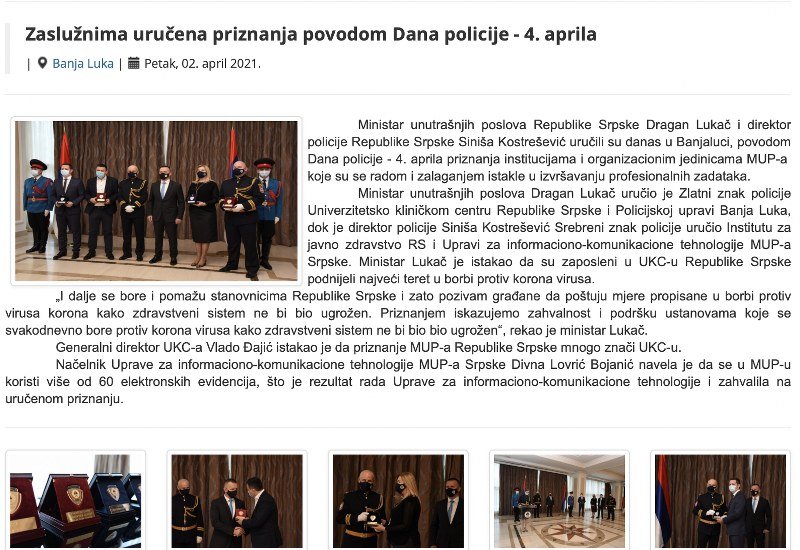 1. Nasilnik Dragan Lukač, takozvani ministar unutrašnjih poslova, uručio je (02.04.) povodom Dana poodavno uništene policije (04.04.), priznanja "zaslužnima".