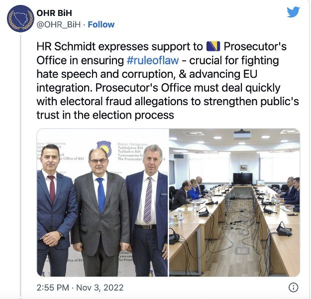 "Korupcija je i dalje jedan od ključnih izazova u BiH i jedan od glavnih razloga za veliki odliv stanovništva. Zato je toliko značajno da se ona iskorijeni i visoki predstavnik će nastaviti pomno da pratiti rad Agencije", saopšteno je iz OHR, na čijem čelu je teško korumpirani Šmit, koji je učinio sve da se priznaju falsifikovani, pokradeni izbori i njegov favorit Dodik proglasi pobjednikom iako je izgubio.