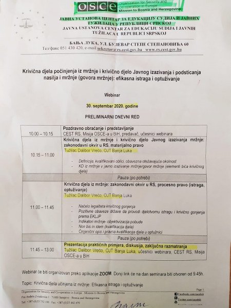 13. Upravo to je slučaj sa Webinarom, pod pokroviteljstvom OSCE-a, koji treba da se održi 30.09.2020. godine, a glavna tema je “Krivična djela počinjena iz mržnje i krivično djelo Javnog izazivanja i podsticanja nasilja i mržnje (govora mržnje): efikasna istraga i optuživanje.