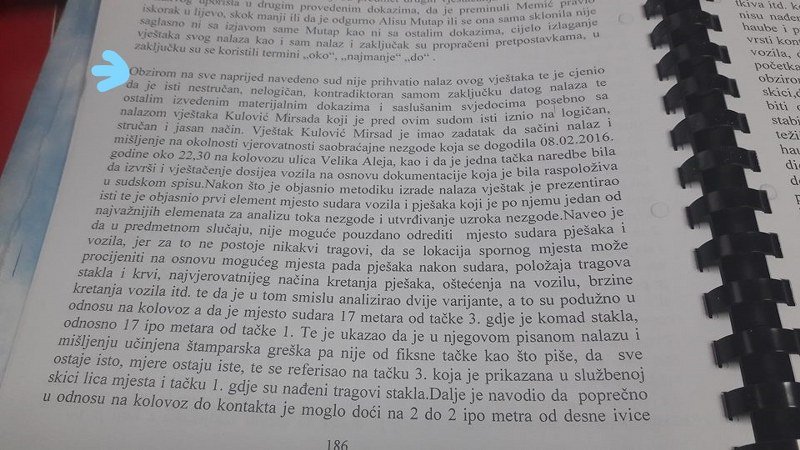 „Ovaj sud, je neprihvatljivim ocijenio nalaz i mišljenje sudskog vještaka Kovačević Ševala (radi se o nalazu koji ide u prilog tezi optužnice, da je u pitanju saobraćajna nezgoda)…jer njegovi zaključci nemaju oslonac u izvedenim dokazima i kao takvi predstavljaju vještakove pretpostavke o tome na koji način se kritični događaj desio. Na ovom nalazu je uglavnom zasnovan krivičnopravni događaj iz predmetnog optuženja…ovaj nalaz je potpuno nelogičan, neuvjerljiv… vijeće u potpunosti odbacuje nalaz vještaka saobraćajne struke Ševala Kovačevića. Sudsko vijeće smatra da je Kovačevićev nalaz kontradiktoran, te je neprihvatljiv za sud. Ovaj vještak je u simulaciji koju je prezentirao Sudu koristio parametre koji ne odgovaraju događajima od 8. februara 2016. godine niti se oslanjaju na svjedočenje Alise Mutap koja je bila u noći 8. februara 2016. godine u društvu sa Memićem. Ovaj vještak je tvrdio da je nakon naleta vozila na pješake Memić „odbačen osam metara, a da je prije toga Memić odgurnuo Mutap koja se našla van gabarita vozila“. Sud primjećuje, da je vještak Kovačević u zaključku svog nalaza naveo „da pješaci idu jedno uz drugo u momentu udara vozila koji udar je bio sa leđa pješaka prednje čeonim bočnim dijelom na zaobljenom dijelu karoserije vozila, a na simulaciji saobraćajne nesreće koju je napravio pomoću programa kao i slika iste simulacije iz vještakovog nalaza prema kojoj vozilo prolazi između dva pješaka odnosno pješaci se nalaze jedno sa jednog bočnog dijela vozila drugo sa drugog“ – iz pravomoćne presude!