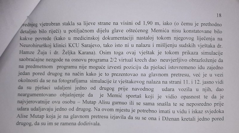 – Objašnjenje vještaka za ovu nelogičnost je da je Memić sportaš koji je vidio opasnost te da je naj vjerojatnije ovu osobu gurnuo ili se sama snašla te se neposredno prije udara udaljavaju jedno od drugog. Za sud je ovakav nalaz neprihvatljiv pogotovo kada se uzme u obzir odgovor vještaka na pitanje zašto pješaci ne idu jedno uz drugo kako je to u simulaciji prikazano gdje je on odgovorio da po programu to nije izvodljivo. Sud zaključuje da vještak ovaj nalaz nije sačinio u skladu sa strukom, da su fotografije simulacije i sama simulacija kontradiktorne sa samim zaključkom kao i sa izjavom svjedoka Alise Mutap. Sud u presudi navodi da je Mutap pred ovim sudom izjavila da su ona i preminuli Memić kretali se na način jedno pored drugog, da su im se ramena dodirivala. Sud smatra da su Kovačevićevi navodi „paušalni, špekulacija čak i neprimjereni i neozbiljni za jedno vještačenje“. Sudsko vijeće dalje navodi da je vještak na pitanja odbrane ili sudskog vijeća da pojasni određene nejasnoće „ulazio u rasprave bez konkretnog odgovora sa primjetnom nervozom“. Sud je ocijenio da je nalaz vještaka Kovačevića „nestručan, nelogičan, kontradiktoran samom zaključku datog nalaza te ostalim izvedenim materijalnim dokazima i saslušanim svjedocima.“