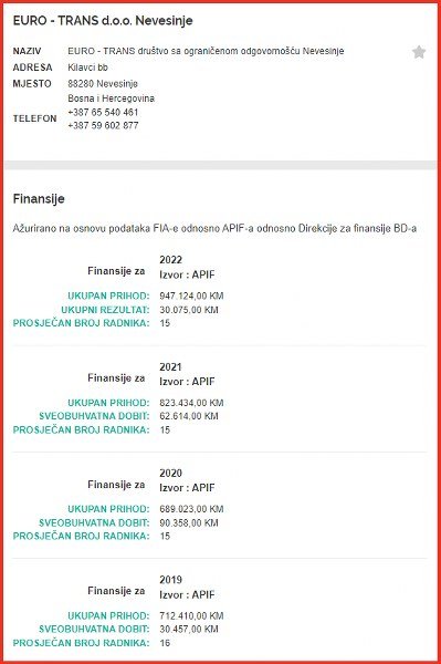Uporedi li se prošlogodišnje poslovanje njihovog porodičnog „Euro-Transa“ sa pandemijskom 2020. godinom, kada su takođe tenderski ugovori bili na potpisu, prihod je porastao za gotovo 260.000 KM, sa 689.023 KM na gorepomenutih 947.124 KM.