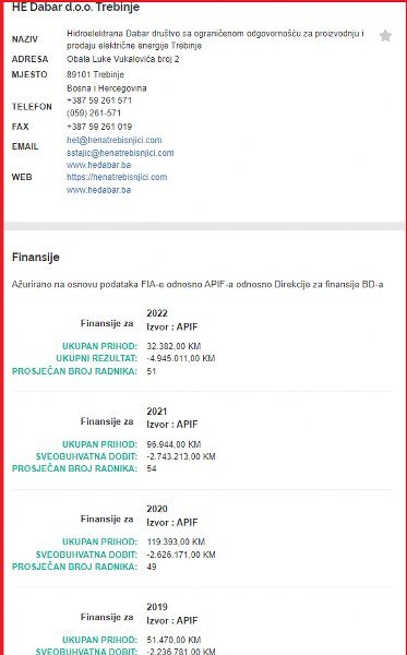 Ponovo poređenja radi, Hidroelektrane Dabar 2022. godinu završile su sa prihodom od tek 39.382 KM i zabilježile su gubitak od gotovo pet miliona KM. Ovo javno preduzeće je za samo godinu dana porotnulo za dodatnih 2.210.798 KM.