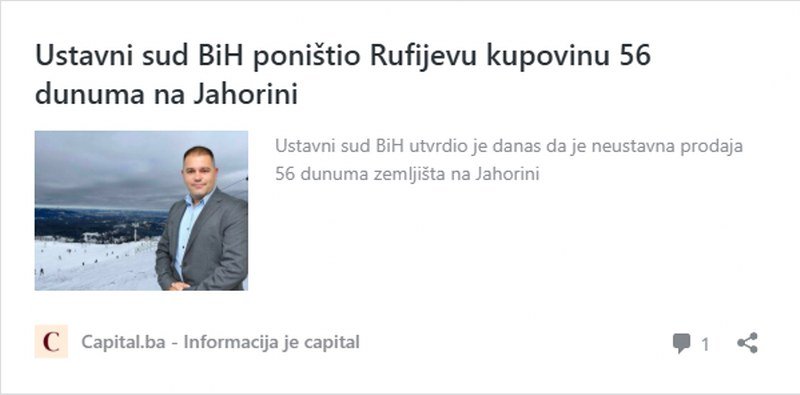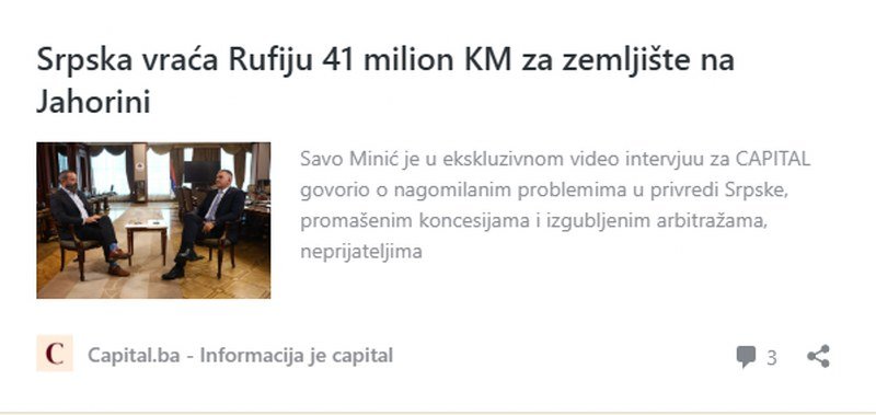 Inače, premijer Republike Srpske Savo Minić rekao je u jučerašnjem intervjuu za CAPITAL da se će Vlada pod pritiskom Ustavnog suda BiH raskinuti ugovor o prodaji zemljišta na Jahorini za 41 milion KM.